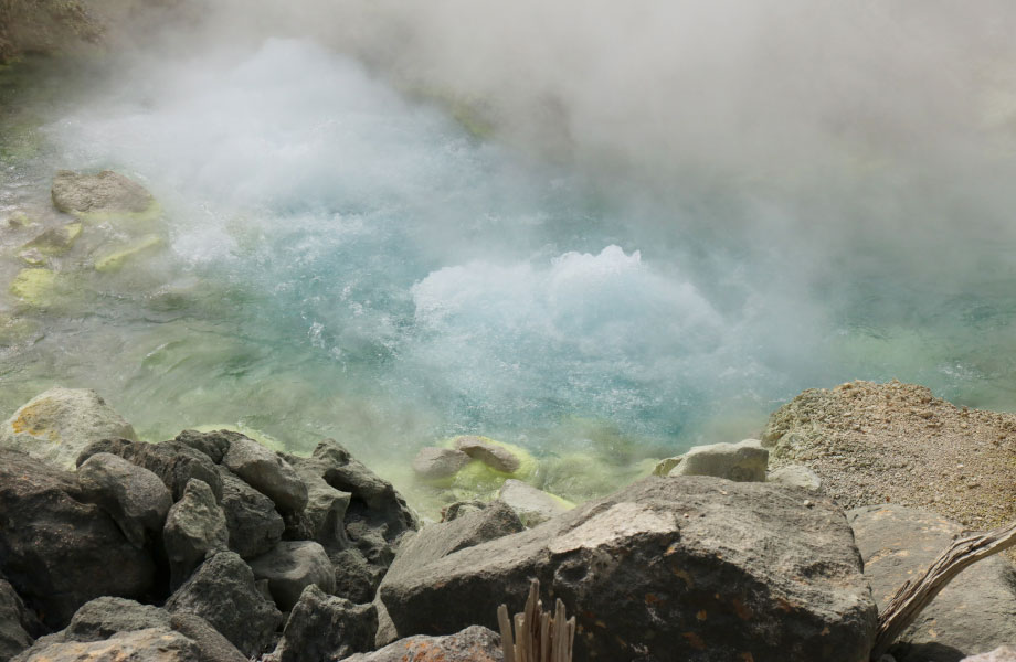 この温泉地では、地盤であるラジウム鉱⽯が地中から噴出される温泉(⽔)によって分解されることで低線量の放射線ガスを発⽣させています。これが「ラドンガス」です。