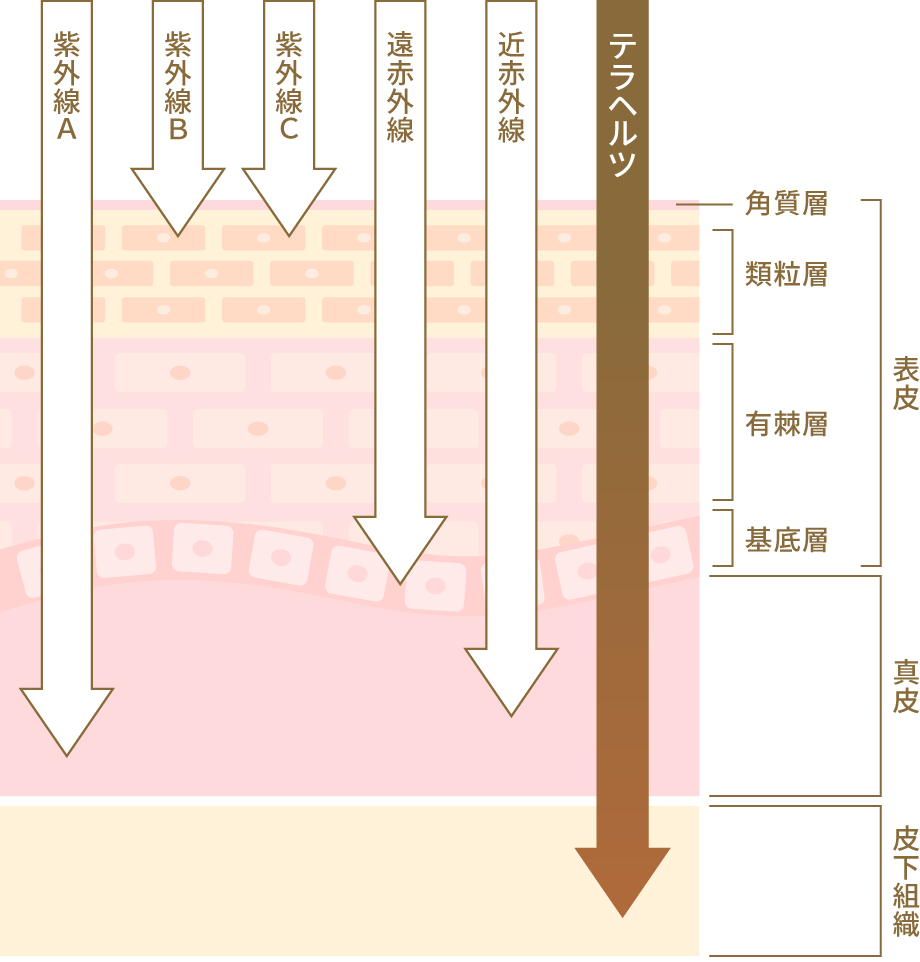 そのため、テラヘルツ波を⽤いることにより、表⽪までしか温まらなかった遠⾚外線等とは⽐較にならないほど体の芯から温めることができることによって、⾎⾏促進、凝りや痛みの緩和などの効果が期待できます。